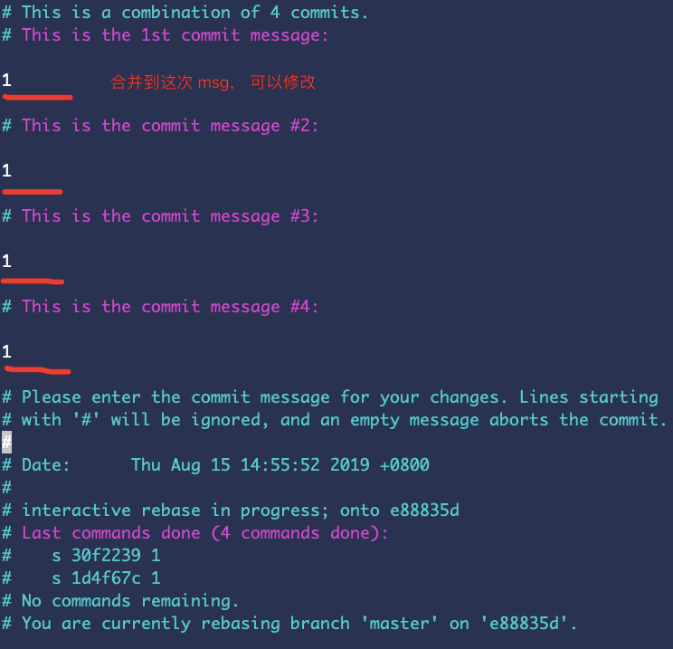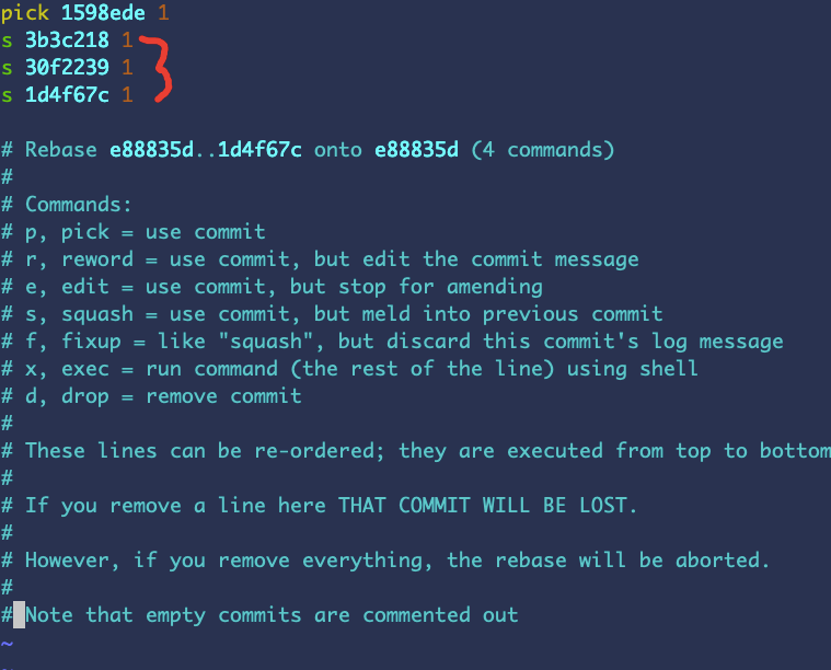我们要把最后3次提交合并到第一条,所以将最后3个 pick 改成 s, 接着 wq保存退出。