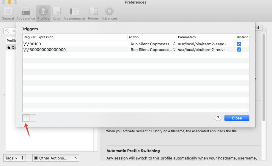 配置iTerm2 1、打开 iTerm2 => Preferences => Profiles => Advanced => Triggers Edit